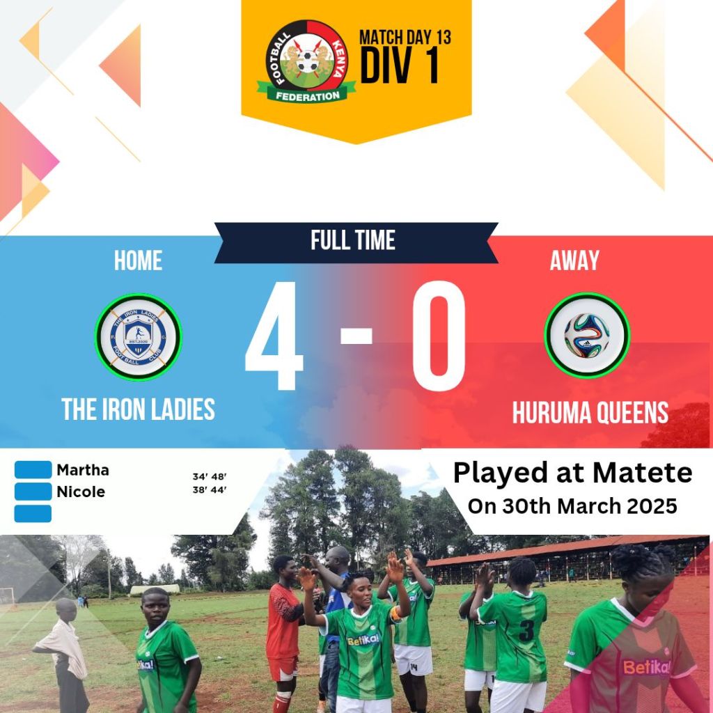 On match Day 13 in the Women Div I League, The Iron Ladies Soccer Club continued their impressive run of form with a resounding 4-0 victory over Huruma Queens, taking a significant step closer to promotion to the National Super League.