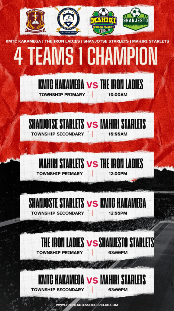 Kakamega is set for an action-packed day of women’s football as four formidable teams face off in a thrilling round-robin showdown. KMTC Kakamega, The Iron Ladies, Shanjoste Starlets, and Mahiri Starlets will battle for supremacy in a high-energy contest that promises skill, passion, and pure game-day excitement.